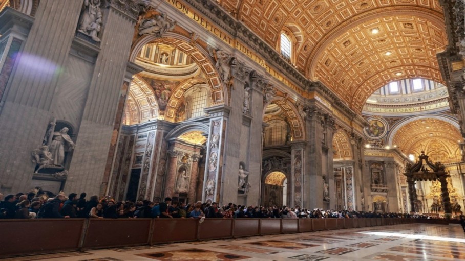 Mọi người xếp hàng chờ vào Vương cung thánh đường Thánh Phêrô để viếng di hài Đức Bênêđictô ngày 04. 01. 2023. (Ảnh: Hải An)